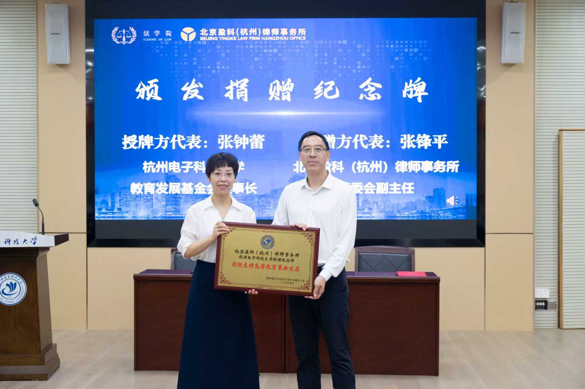 仪式中,校教育发展基金会理事长张钟蕾与盈科杭州律所签署捐赠协议并给盈科杭州律所颁发捐赠纪念牌。